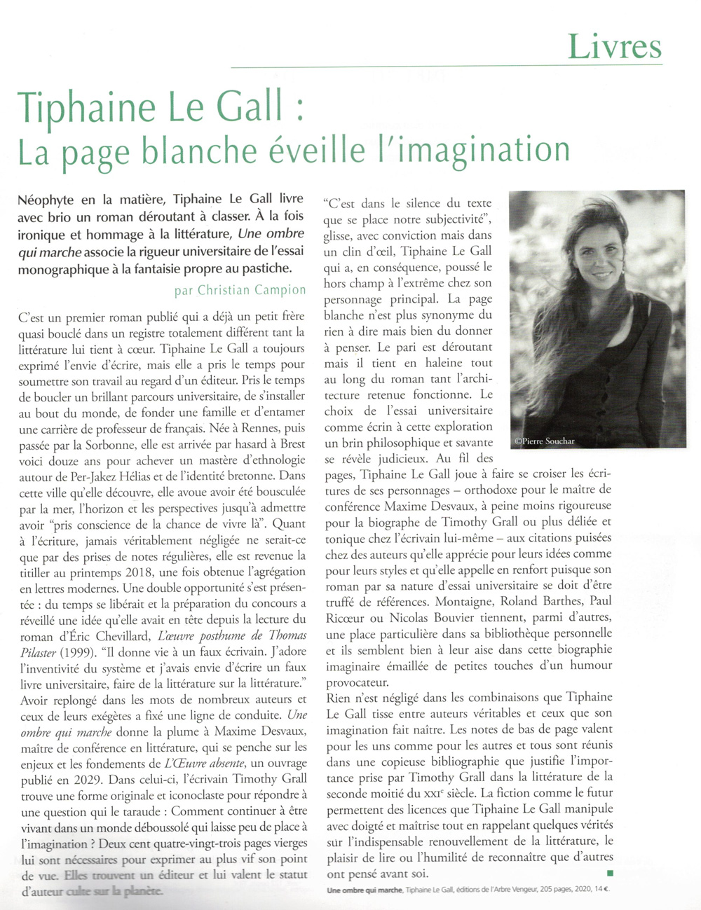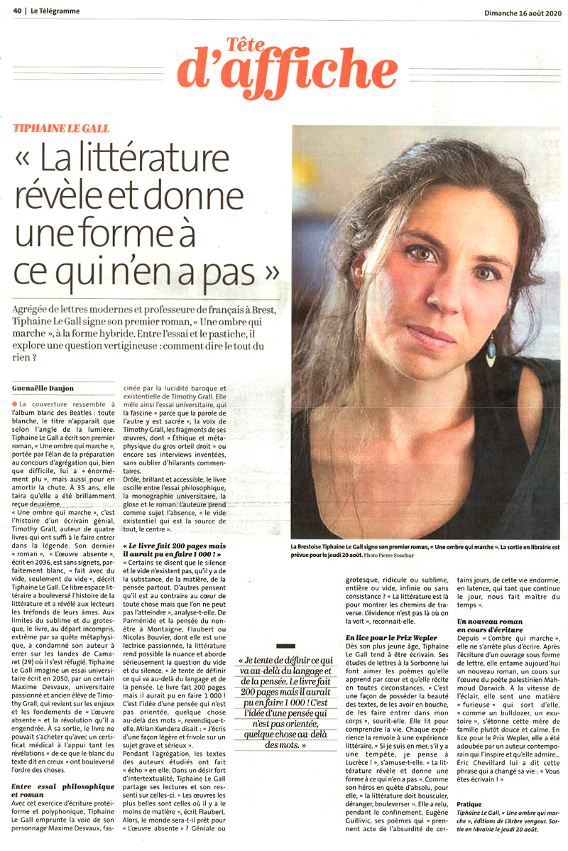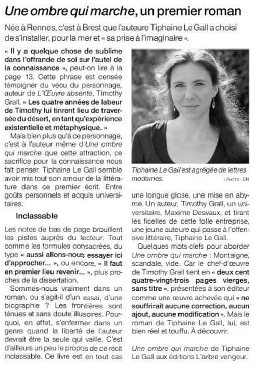 “Tiphaine Le Gall livre avec brio un roman déroutant à classer. À la fois ironique et hommage à la littérature, “Une ombre qui marche” associe la rigueur universitaire de l’essai monographique à la fantaisie propre au pastiche.”