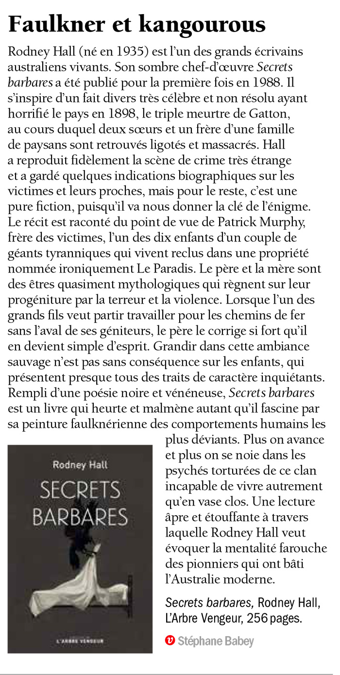 “Un diamant noir, vraiment très noir qui nous vient d’Australie. Mais les fulgurances de l’écriture de Rodney Hall détiennent le pouvoir de déchirer les ténèbres. Incroyable !”