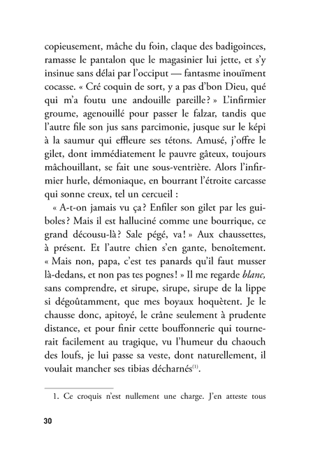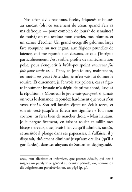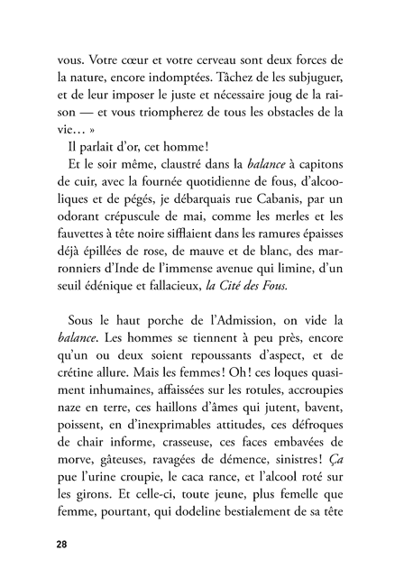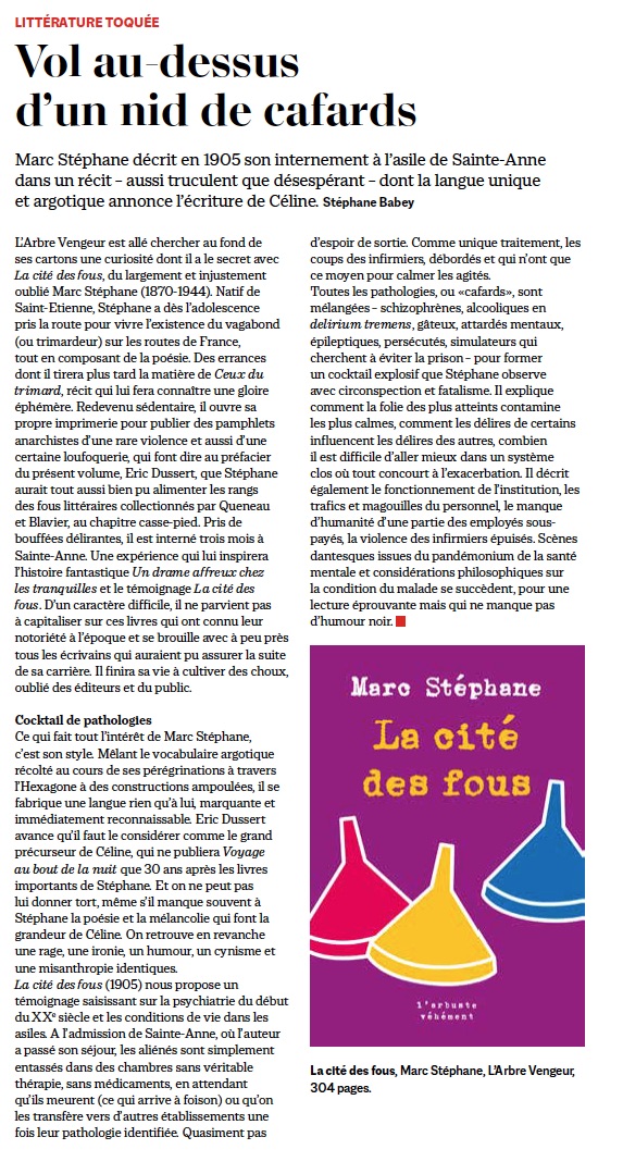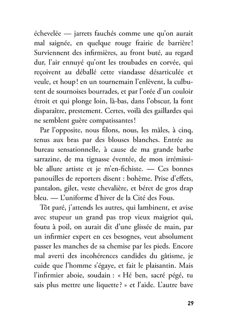 Voyage au bout d’un enfer personnel et collectif, cette Cité des fous est le récit détaillé de sa plongée dans ce monde chaotique interdit à quiconque n’était pas psychiatre, infirmier ou… aliéné. Et parce que cet écrivain désormais englouti possède une langue d’une verdeur à faire pâlir un certain Céline, parce que ses lignes mêlent à une intense compassion un refus du pathos fétide, il transforme ce qui pourrait être un réquisitoire en odyssée au pays de la folie.