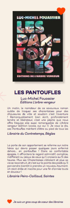 Nous réalisons à l’approche des grands jours de fête que rarement un de nos livres aura reçu un tel accueil des libraires, et parfois de certains que nous ne connaissions que de nom ou de réputation : Les Pantoufles de Luc-Michel Fouassier se glisse(nt) dans un grand nombre de sélections pour la fin d’année, et nous en sommes contents, car il apparaît que ce petit livre fait des heureux. Ainsi des libraires de Nouvelle-Aquitaine qui ont publié un catalogue spécial Noël.
