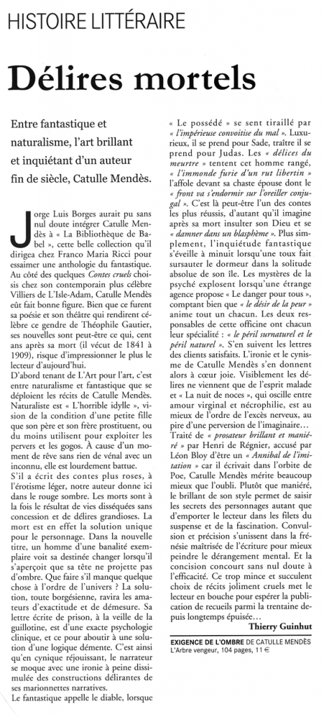 Très extraordinaire mais parfaitement délicieux, comme un buffet froid, quand l’histoire est racontée avec un détachement et une cruauté parfaite par Catulle Mendès, l’un des plus talentueux représentants de l’esprit fin de siècle français. Digne successeur du Villiers des Contes cruels, il exerça son humour souvent grinçant, son cynisme mâtiné d’absurde avec une verve et une habileté qui ont traversé le siècle nous séparant de sa mort. Amateurs de fantastique et de surnaturel, visiteurs éprouvés de musée des horreurs, collectionneurs de morts bizarres, Exigence de l’ombre et ses neuf nouvelles étranges vous attendent : c’est sans danger, quoique…