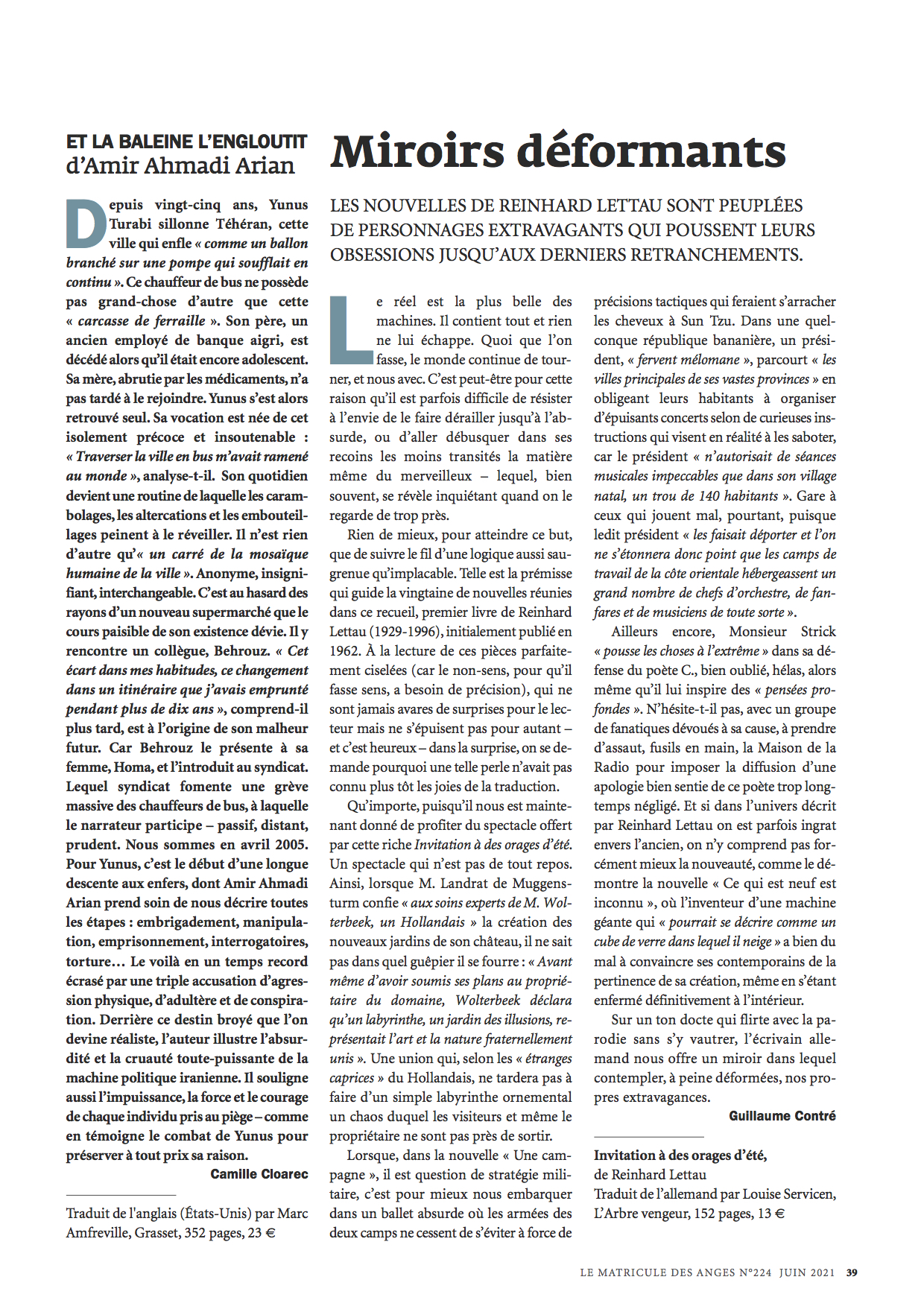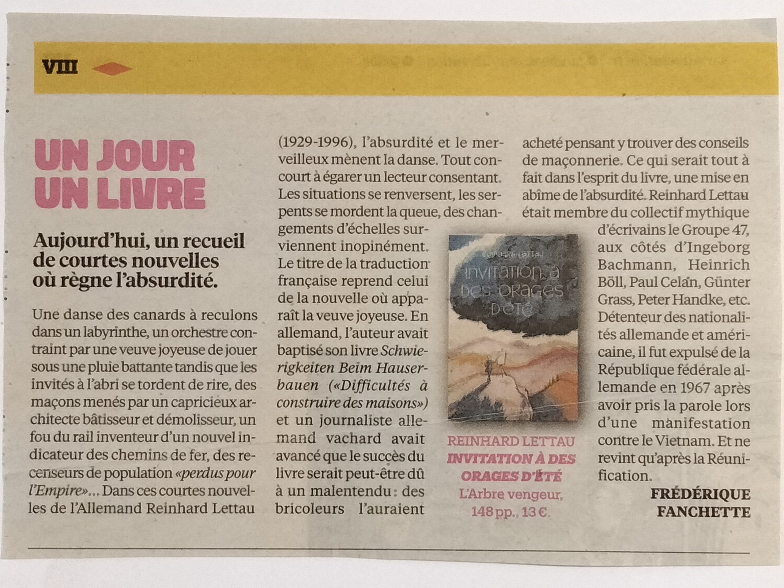 « Les nouvelles de Reinhard Lettau sont ainsi autant de pièges spirituels et inquiétants dont notre imagination ne se libère que difficilement. Nous avons affaire à coup sûr à un dangereux magicien puisqu’il sait apparemment trouver le défaut de la cuirasse grâce auquel l’imaginaire peut s’introduire dans le réel et le bouleverser. »