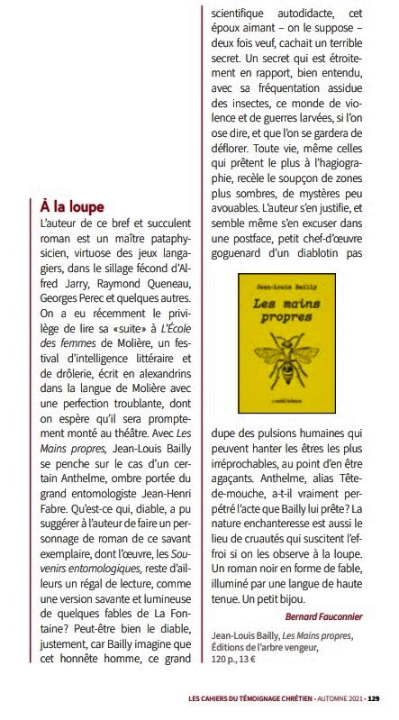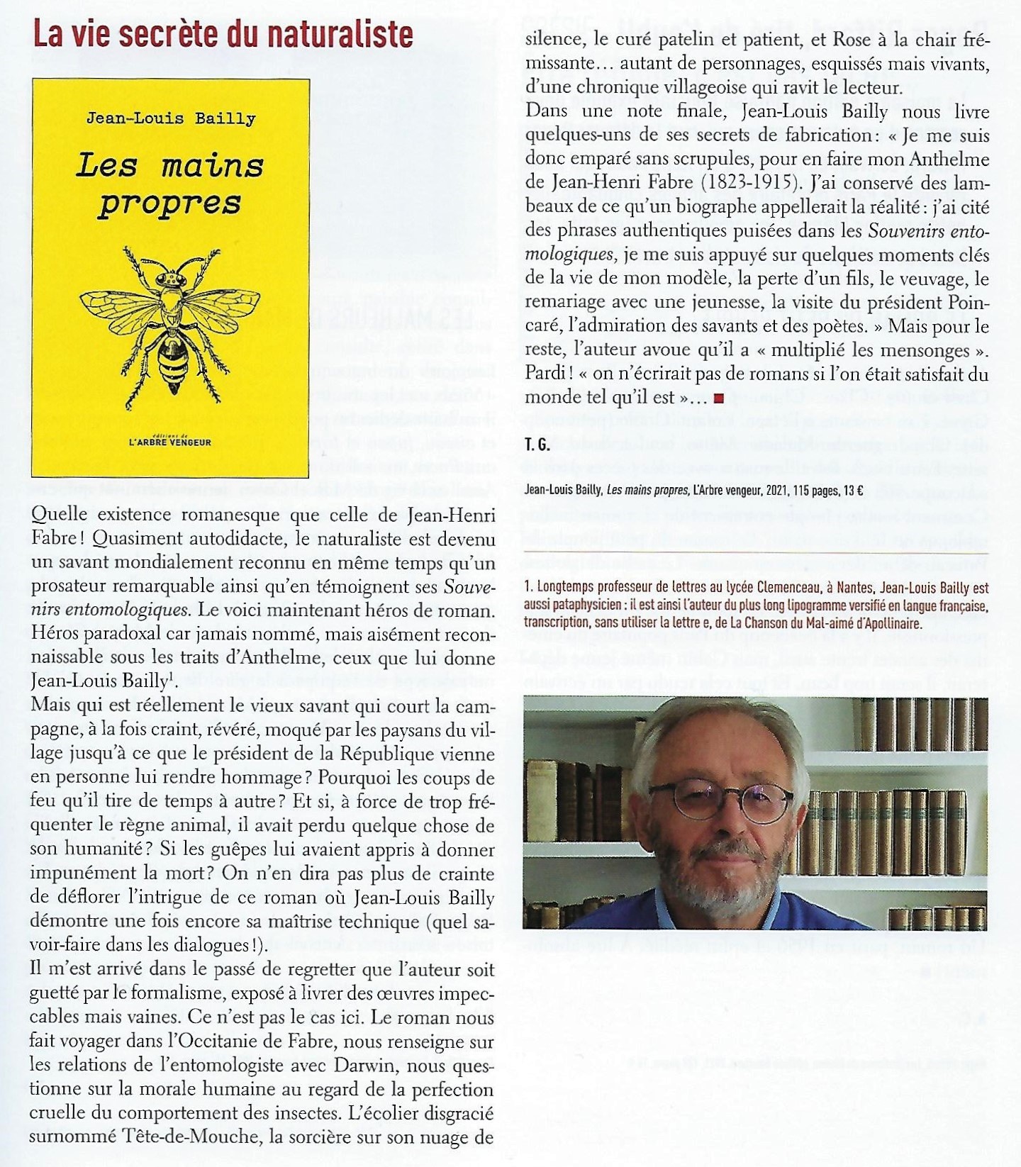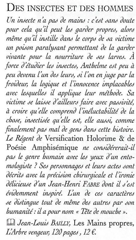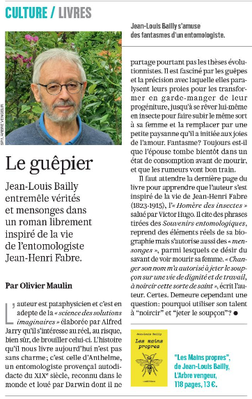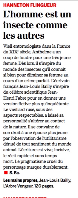 “Le formidable portrait romancé d’un entomologiste fameux devenu meurtrier égotique en puissance sous la plume réjouissante de Jean-Louis Bailly..”