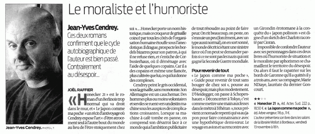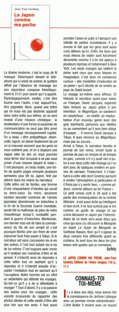 « C’est brun foncé le Japon, et brûlé sur les bords. C’est un brownie couvert d’entailles et de plis, arrosé d’une louchée de neige griffée par le vent. On en mangerait, c’est sûr. On en mangera, sans doute. Mais quand ? »