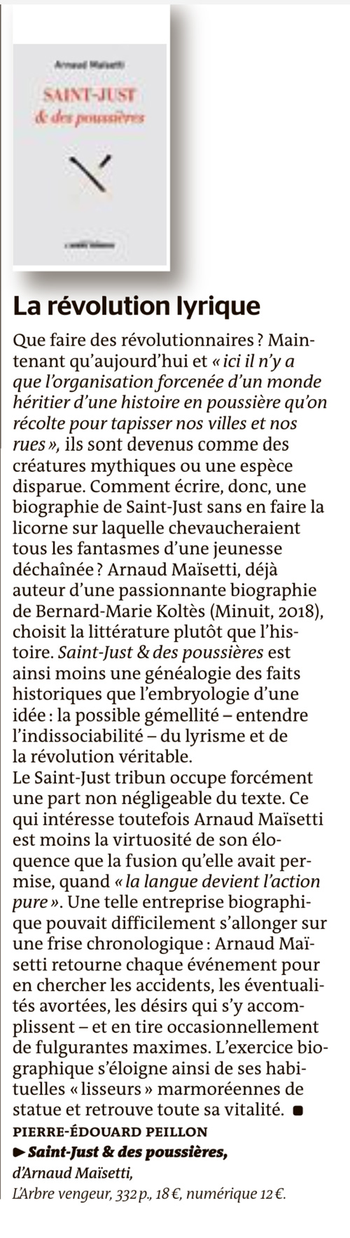 Il y a un réel défi à oser aborder la figure du révolutionnaire Saint-Just avec le prisme de la littérature sans renoncer à en éclairer la dimension politique. Arnaud Maïsetti s’est approché de cet astre qui n’en finit pas de brûler pour nous raconter, pas à pas, le parcours d’un jeune homme à la beauté ambiguë qui usa d’une langue emportée pour dénoncer, dénoncer sans fin et jusqu’à la lie l’injustice faite à l’homme. Longeant l’Histoire avec les libertés de l’écrivain, l’auteur nous conte au plus près, au plus fort, les soubresauts de celui qui conquit le pouvoir avec son alter ego Robespierre pour venger le sort de ceux qui ne l’eurent jamais. Un livre de poussière et de lumière, un livre fort, fait de tremblements et d’exaltation pour nous exposer une figure qui nous hante sans fin.