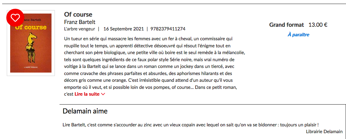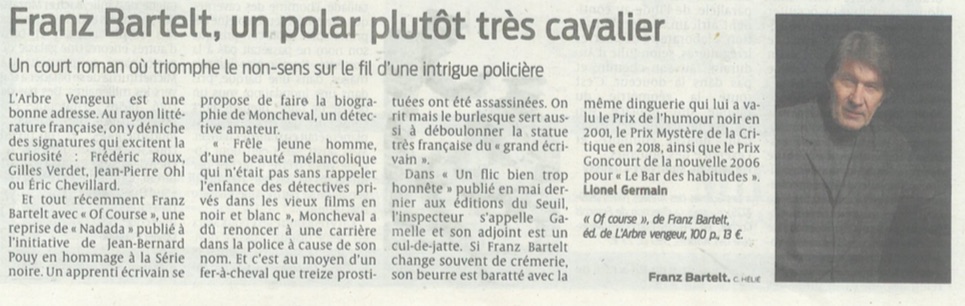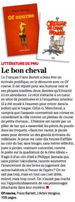 Un tueur en série qui massacre les femmes avec un fer à cheval, un commissaire qui roupille tout le temps, un apprenti détective désœuvré qui résout l’énigme tout en cherchant son père biologique, une petite ville où boire est le seul remède à la mélancolie, tels sont quelques ingrédients de ce faux polar style Série noire, mais vrai numéro de voltige à la Bartelt qui se lance dans un roman comme un jockey dans un tiercé, avec comme cravache des phrases parfaites et absurdes, des aphorismes hilarants et des décors gris comme une orange. C’est irrésistible quand on attend d’un auteur qu’il vous emporte où il veut, et si possible loin de vos pompes, of course… Dans ce petit roman, c’est la quintessence d’un auteur au galop unique, au trot entêtant, au pas cadencé. Un bonheur.