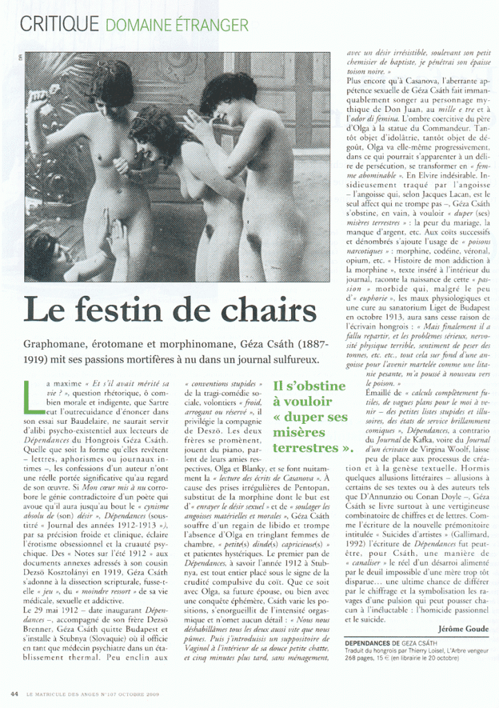 Chacun de ces qualificatifs définit à un moment ou un autre la figure de Géza Csáth, homme aux multiples dépendances. Près d’un siècle après sa mort, il continue, en Hongrie d’où il est originaire, et dans le monde où son oeuvre est largement traduite, à susciter interrogations et impressions contradictoires. Avec son journal enfin traduit en français, on découvre la face cachée de cet écrivain génial qui mit à se torturer une passion toute particulière.