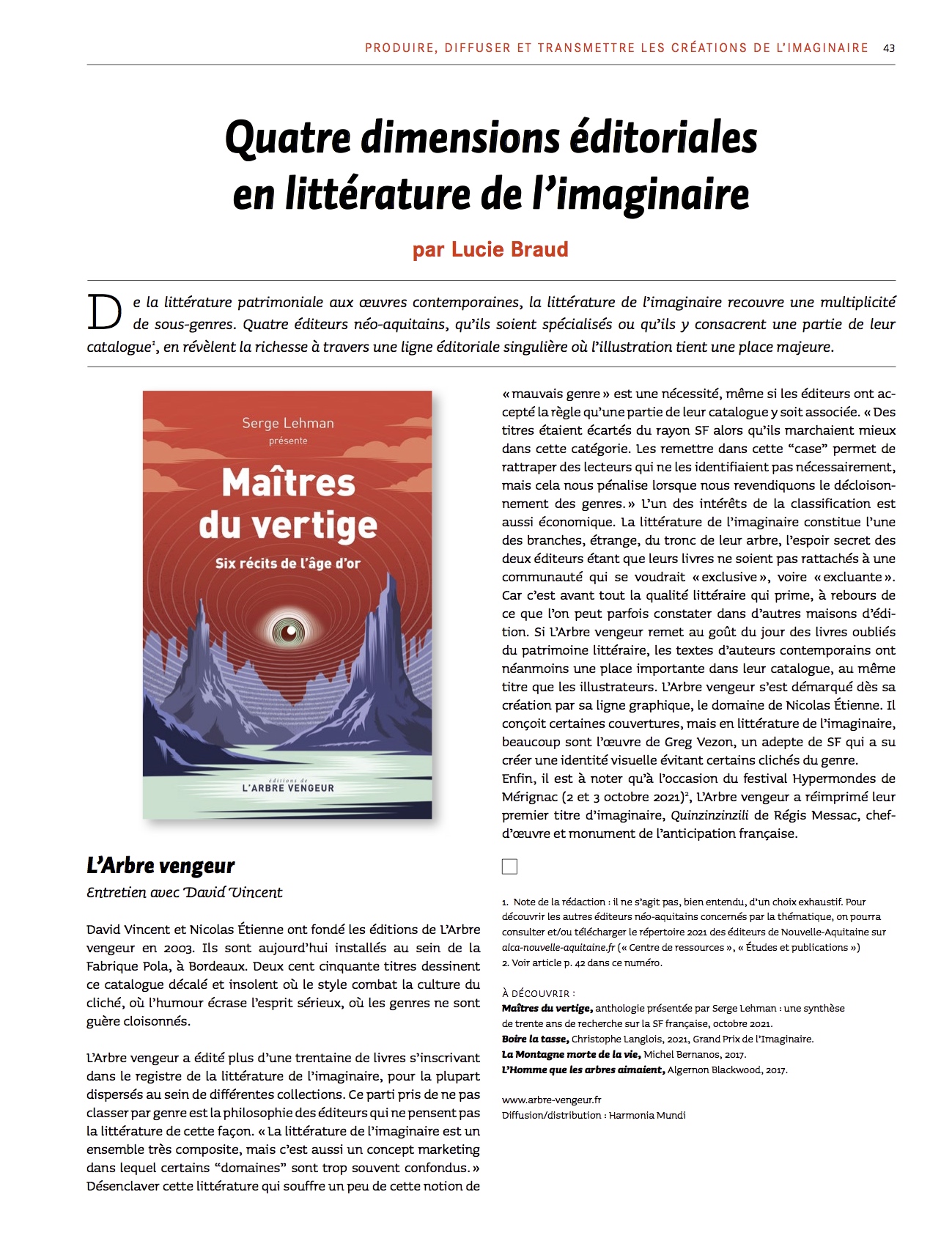 “Quatre éditeurs néo-aquitains, qu’ils soient spécialisés ou qu’ils y consacrent une partie de leur catalogue, révèlent la richesse d la littérature de l’imaginaire à travers une ligne éditoriale singulière où l’illustration tient une place majeure.”