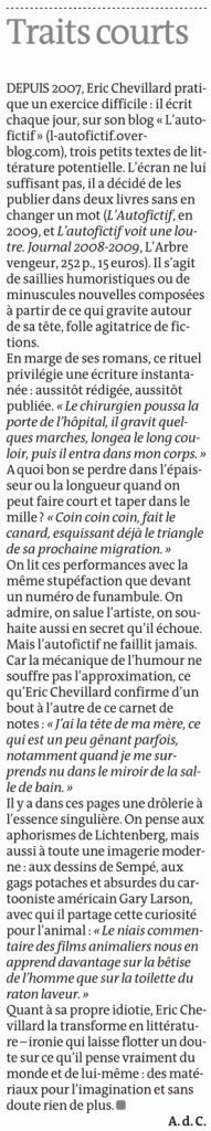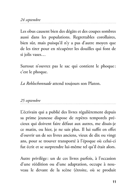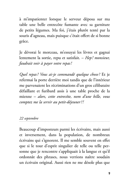 « Le diariste est ici son personnage principal, inventeur quotidien et permanent de son exquis poncif. Il y est injuste, arbitraire, subjectif, égocentrique, surréaliste, cruel et drôle. Délirant mais rigoureusement. »