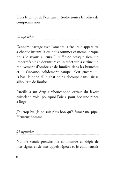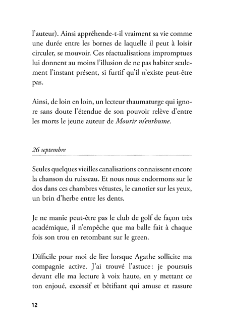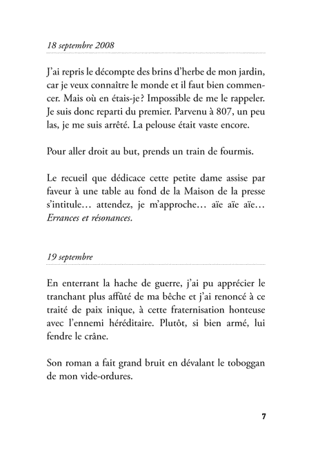 « Trois phrases par jour, minimales, essentielles, fragments d’un faux journal intime condensé en faux haïkus. Un an d’aphorismes et de pensées, derrière lequel la poésie peut folâtrer en douce. »