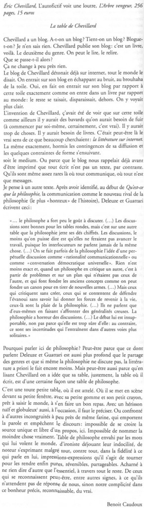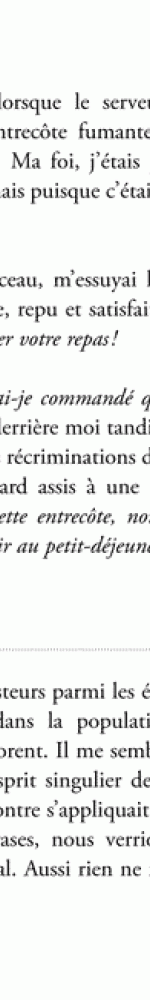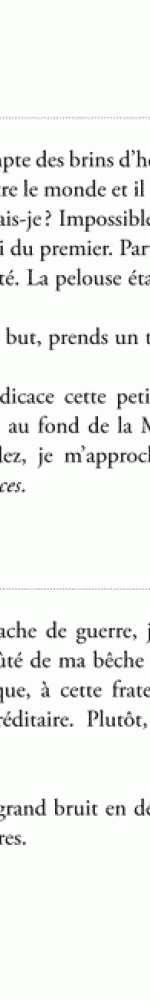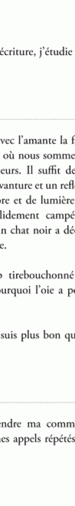 « Il se vante d’avoir assisté au dernier meeting de Raymond Barre, je n’y étais pas, mais ce même jour j’ai vu une loutre qui fendait lentement les eaux calmes de la Briance et, du coup, allez comprendre ça, moins vif est mon regret d’avoir raté le dernier meeting de Raymond Barre ce jour-là. »