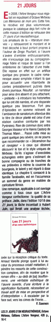 Si Octave Mirbeau était un grand romancier, il restait cependant conscient que ce genre bourgeois méritait d’être allègrement bousculé : son entrée dans le siècle nouveau, il la fera avec un Décaméron fou et ravageur, placé sous le signe d’une maladie alors en vogue, la neurasthénie. Comme des contes cruels où défile une humanité inquiétante et odieuse qui provoque ses ricanements inspirés, les scènes de cure pyrénéenne qu’il imagine nous offrent la peinture de fripouilles, crapules, imbéciles et autres sales individus auxquels il règle leur compte d’un trait impitoyable.