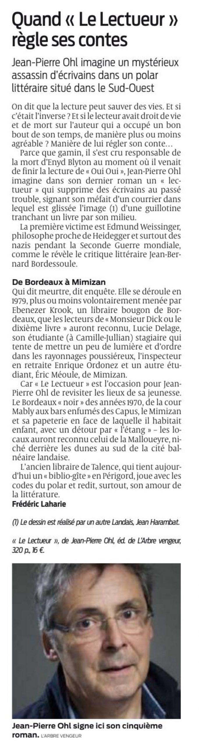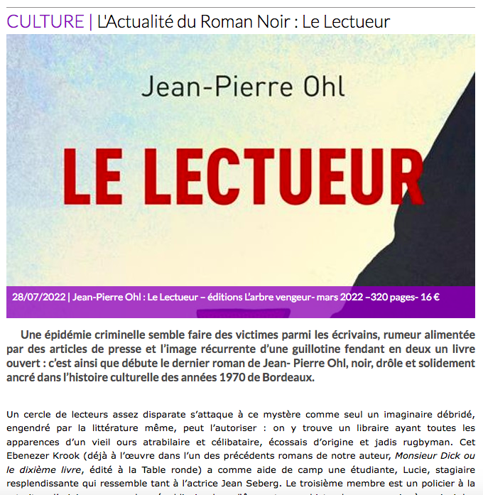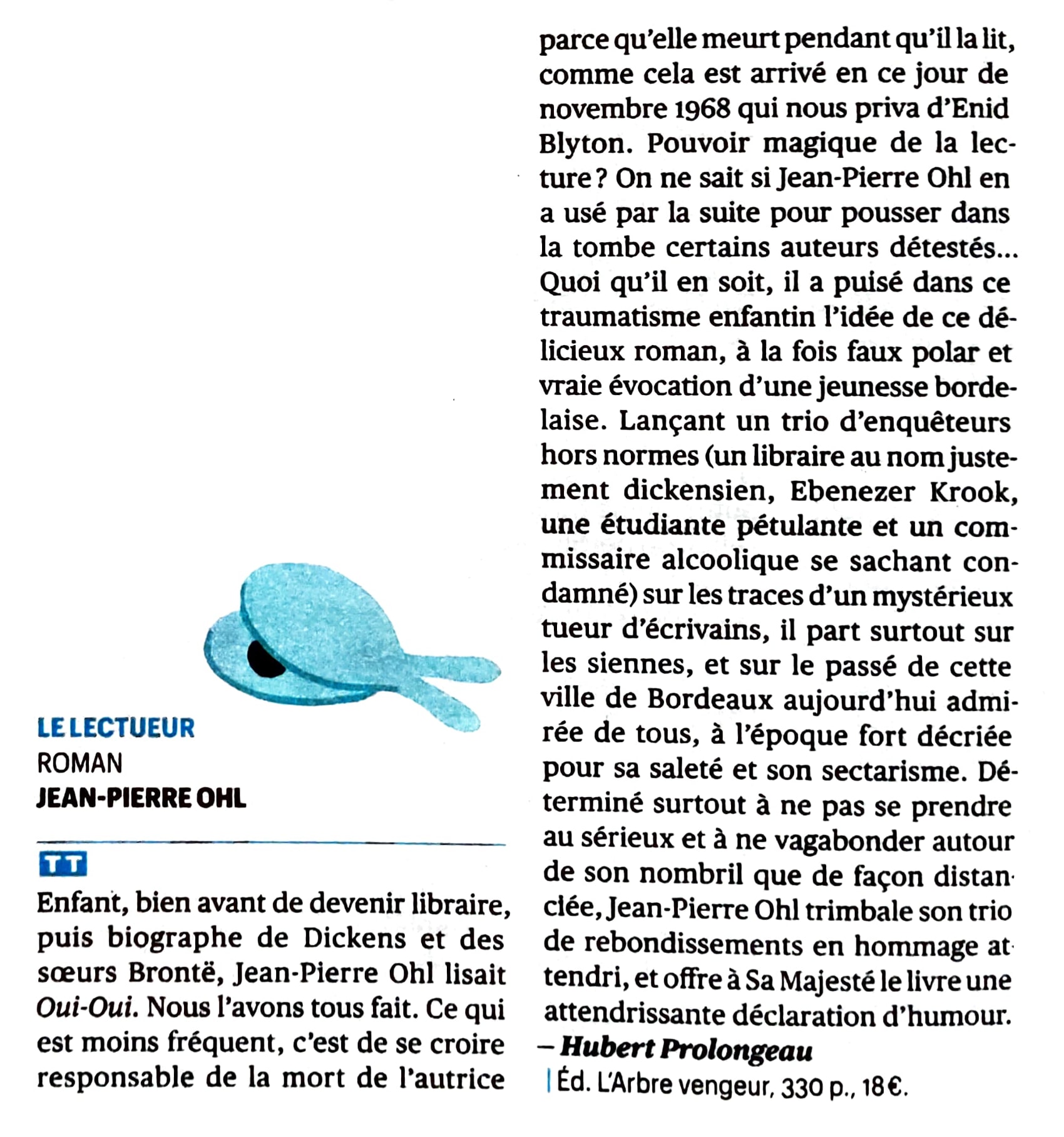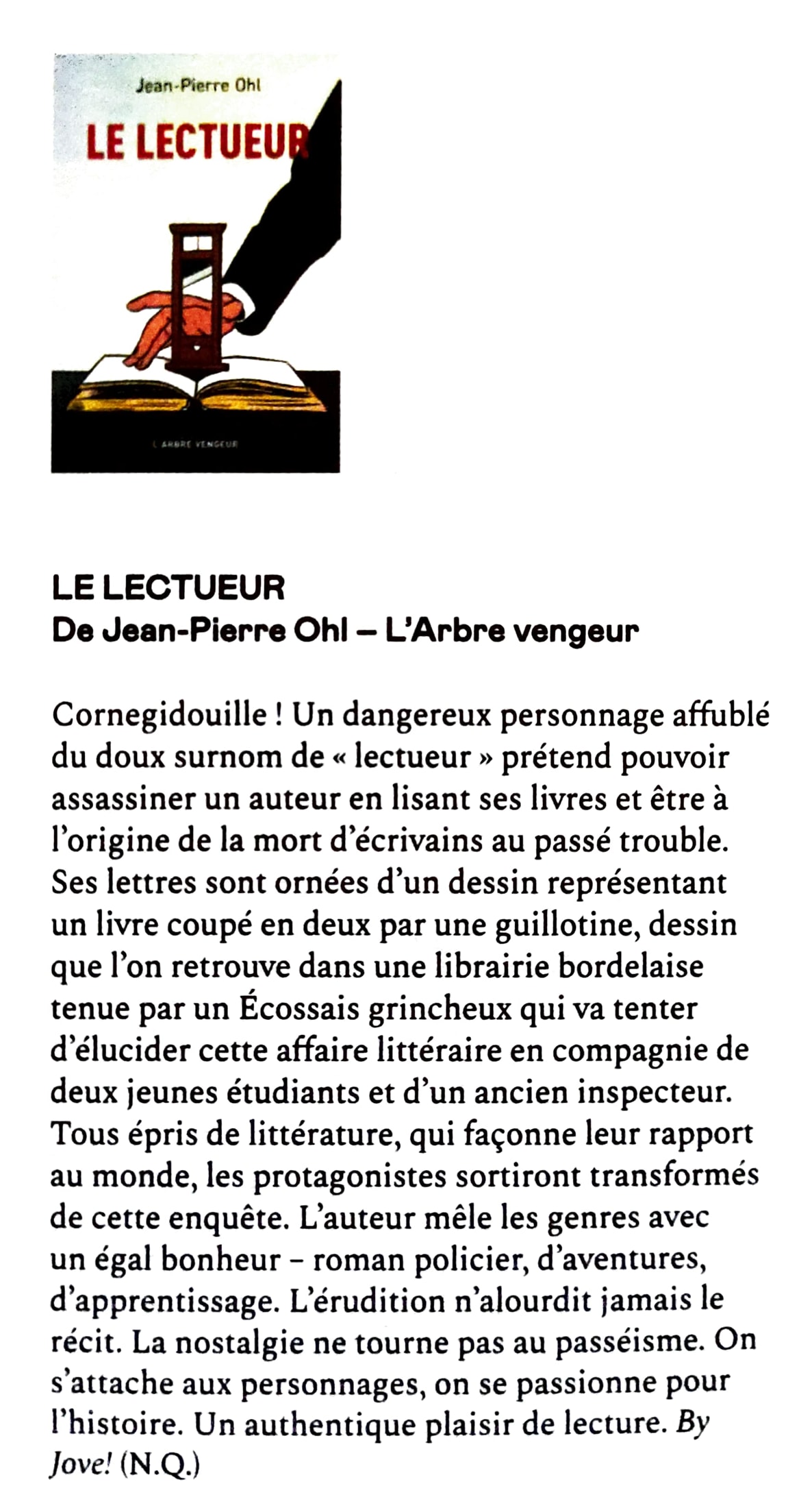 Enfant, Jean-Pierre Ohl s’est cru responsable de la mort de son idole Enid Blyton, la radio ayant annoncé le disparition de la créatrice de Oui-Oui alors qu’il achevait un de ses livres. C’est sans doute pour conjurer ce traumatisme qu’il nous offre aujourd’hui un roman alambiqué et ambré comme il sait les imaginer, nous entraînant à la suite d’une improbable brochette d’enquêteurs penchés sur l’identité du “lectueur”, un vengeur qui se charge de faire payer aux “grands” auteurs leurs viles actions. On en retrouve en effet quelques uns victimes de lettres qui semblent les terrasser. Placée entre un libraire digne de Dickens et porté sur la bouteille et un commissaire en retraite qui se sait condamné, une jeune étudiante va ressusciter une époque révolue, celle où l’on croyait aux livres…