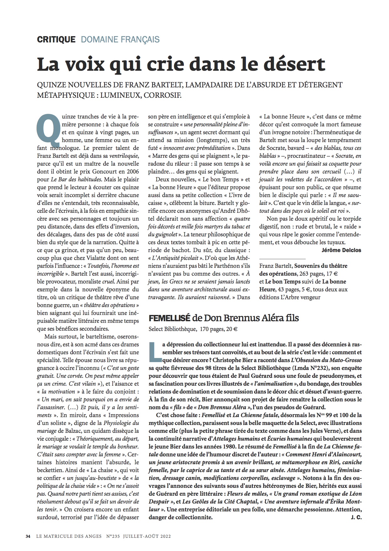 Du critique de théâtre persuadé que sa plume est « une arme de destruction massive » qui aurait mérité une bonne guerre, à l’adepte de la politique de la chaise vide, en passant par un ancien surdoué jamais remis de sa découverte de la petite trompette rouge, ils forment une équipe de haute volée qui permet à l’auteur du Jardin du bossu de donner toute la mesure de son inspiration puisée au café du coin ou pas tellement plus loin.