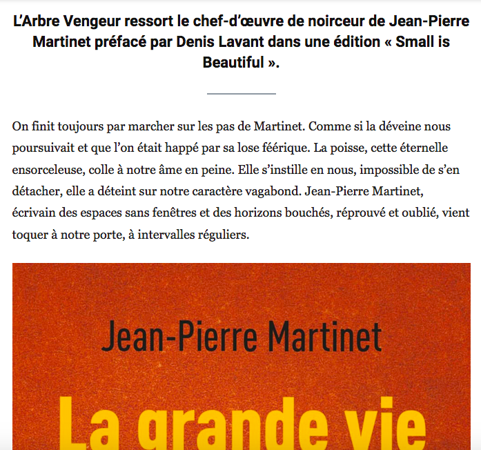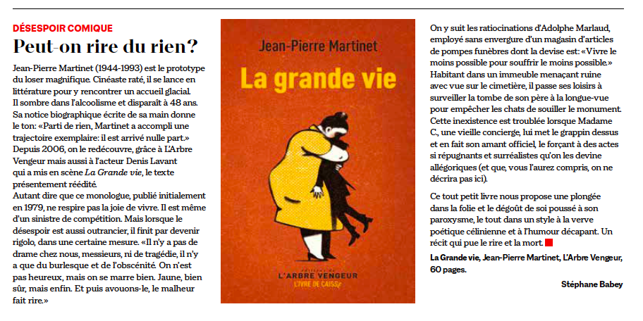 Jean-Pierre Martinet, l’auteur de ce texte halluciné paru en 1979, est mort oublié en 1993 : on a redécouvert depuis le sombre génie et la folie magnifique d’une œuvre sans équivalent. Avec ce court livre, c’est son humour qui explose : il est d’un noir détergent.