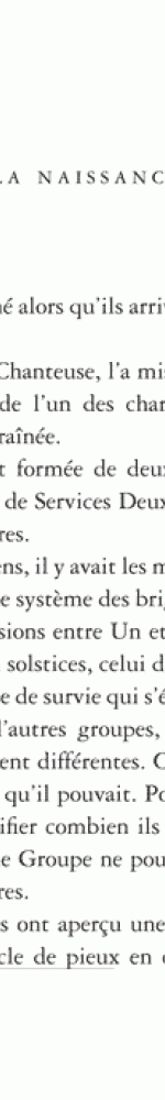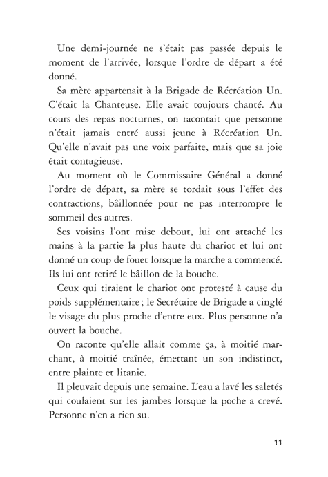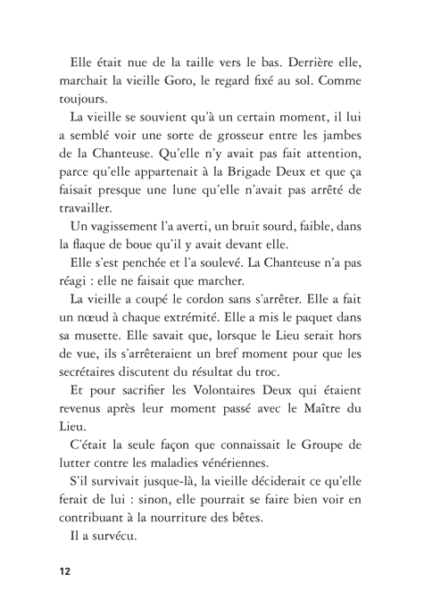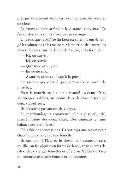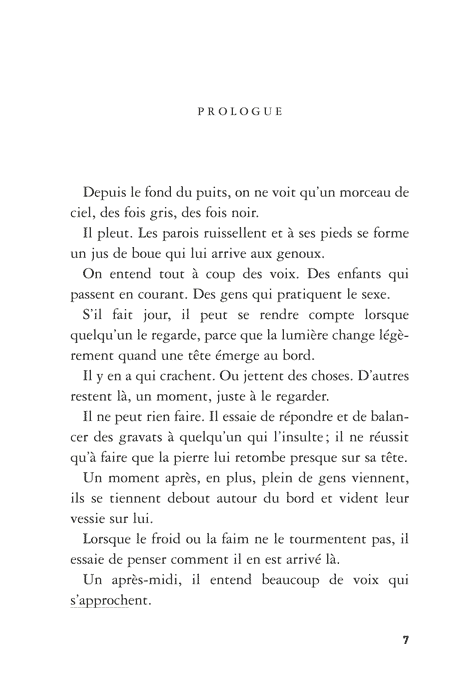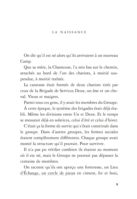 Le Groupe qui l’accepte évolue dans un monde d’après: déchets, gravats, pluie incessante. Cette fin du monde a pour décor des immondices, pour habitants des humains en fuite permanente et soumis à une loi du plus fort exténuante.