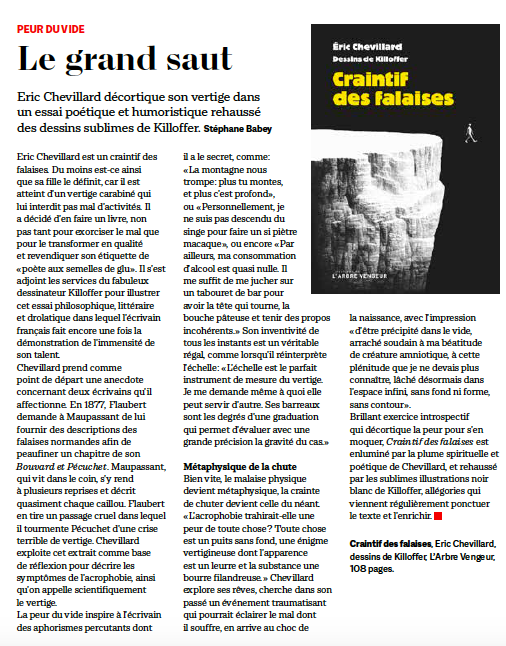 C’est sur l’abrupte côte normande chère à Flaubert et Maupassant, aux environs d’Étretat, qu’Éric Chevillard, poète aux semelles de glu, comme il se désigne, a décidé d’affronter enfin sa peur du vide. C’est que l’on ne peut impunément se laisser traiter par sa fille de craintif des falaises sans réagir. Qu’est-ce d’ailleurs que cet animal ? Un quadrupède gauche et titubant qu’une malédiction a fait naître sur les crêtes où il ne sait pourtant que défaillir. Par bonheur, l’auteur a la main plus agile et plus ferme que le pied et il se fait le conteur de son martyre inavouable, aidé dans sa quête de vérité par tous les écrivains qui l’ont précédé sur les sentiers à risque.