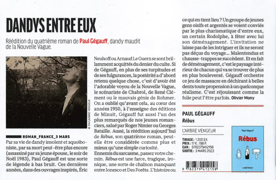 Paul Gégauff est l’auteur de plusieurs romans qu’on trouvait encore il y a peu en tirage de tête chez Minuit. Après Les Mauvais plaisants en 1951 et Le Toit des autres en 1952, il fait paraître en 1957 Rébus qu’il considéra ensuite comme son roman préféré. Celui-ci témoigne autant de l’excentricité de son auteur que de son style, toujours éclatant. Il met en scène Rodolphe, jeune homme riche qui s’ennuie et qui décide un beau jour de convier ses amis pour le déménagement au long cours de sa baraque de vingt-trois pièces classée monument historique. Il est surtout question de “faire la noce” mais sans femmes, et de balancer par la fenêtre le mobilier. Il s’agit aussi de se livrer à un joyeux saccage de l’ordre bourgeois, car rien ne va échapper à leur malicieuse et épuisante furie dévastatrice. Objets puis idées vont passer de vilains moments de remise en question.