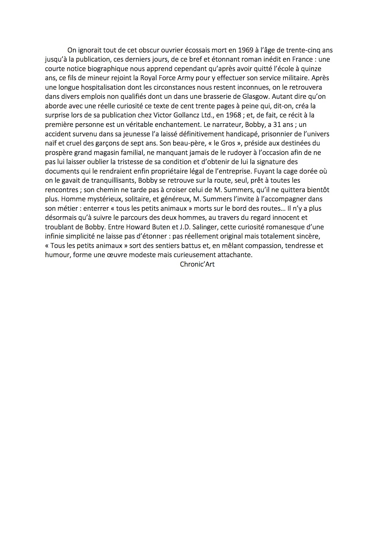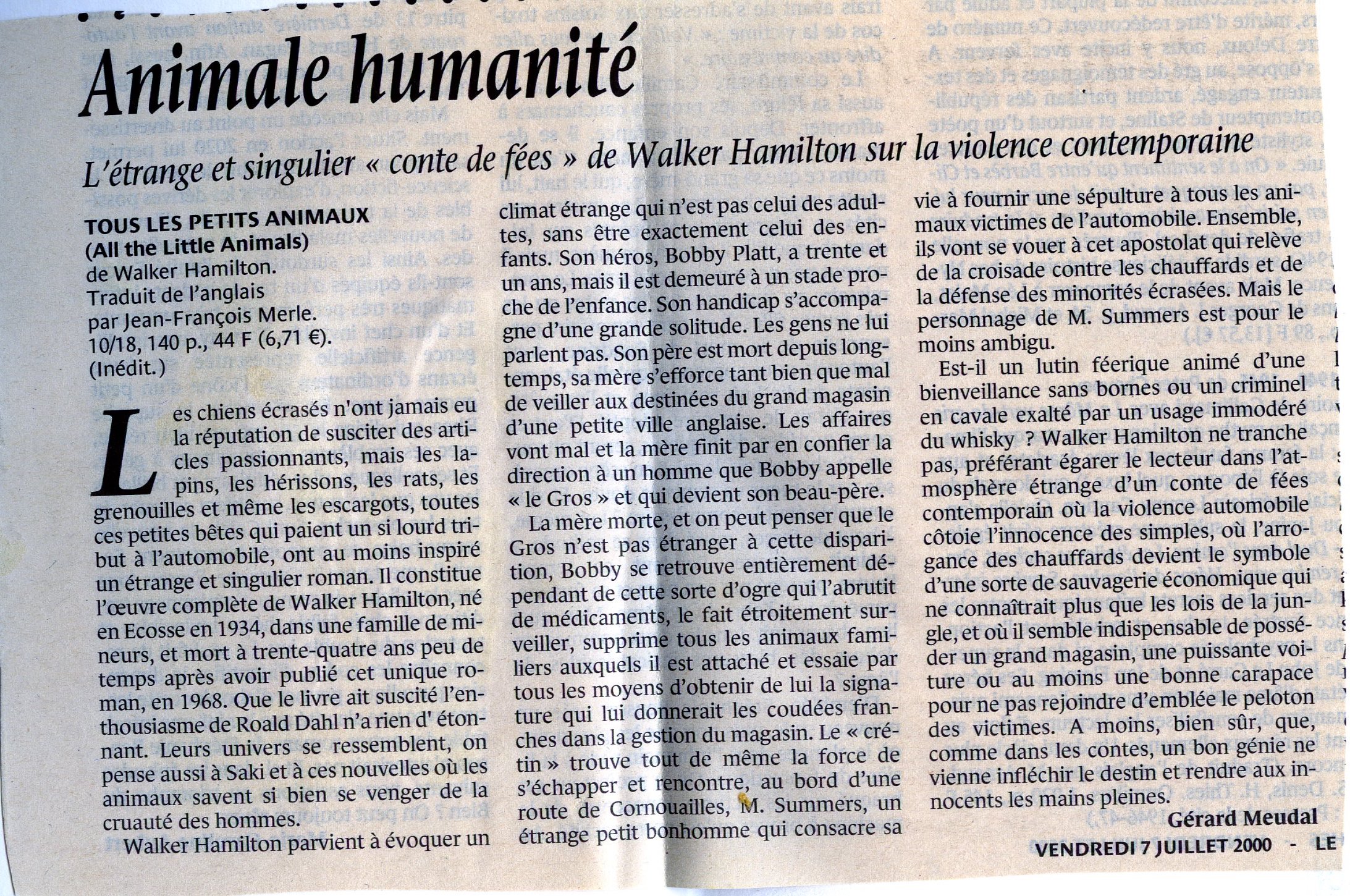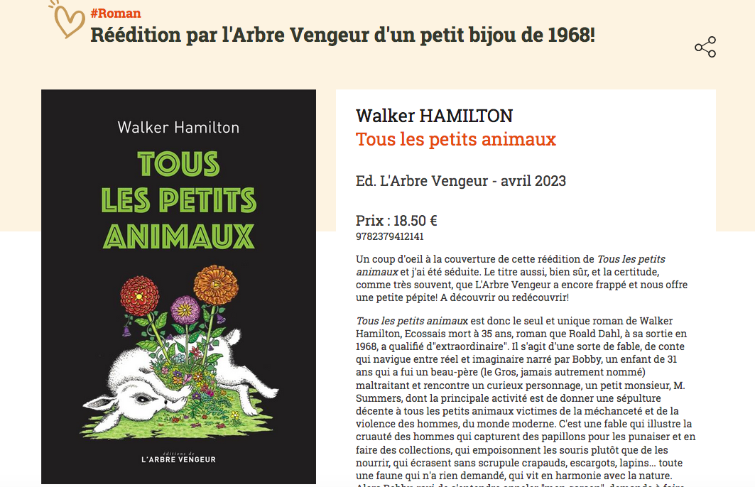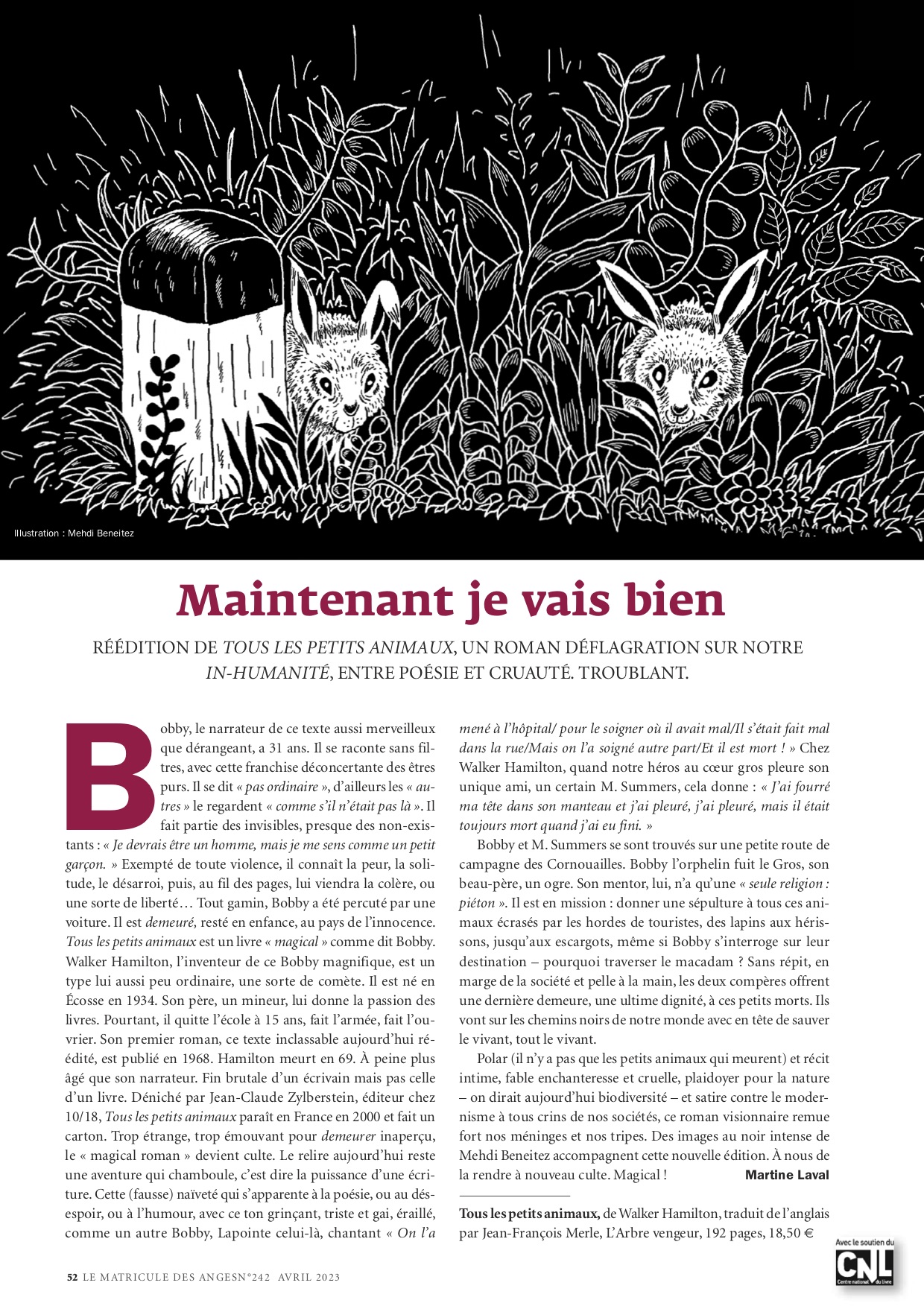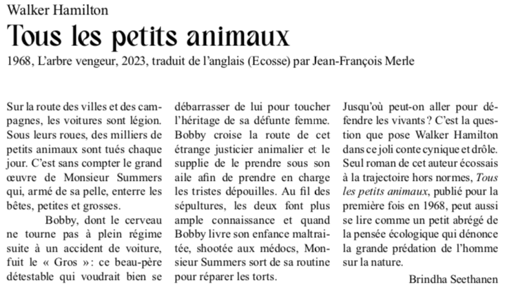 “Dans les interstices de la littérature du XXème siècle, ce joyau noir vaguement effrayant. Court roman amoral et forcené réservant sa délicatesse pour la faune des bords de sentier… Et un remarquable travail d’éditeur !”