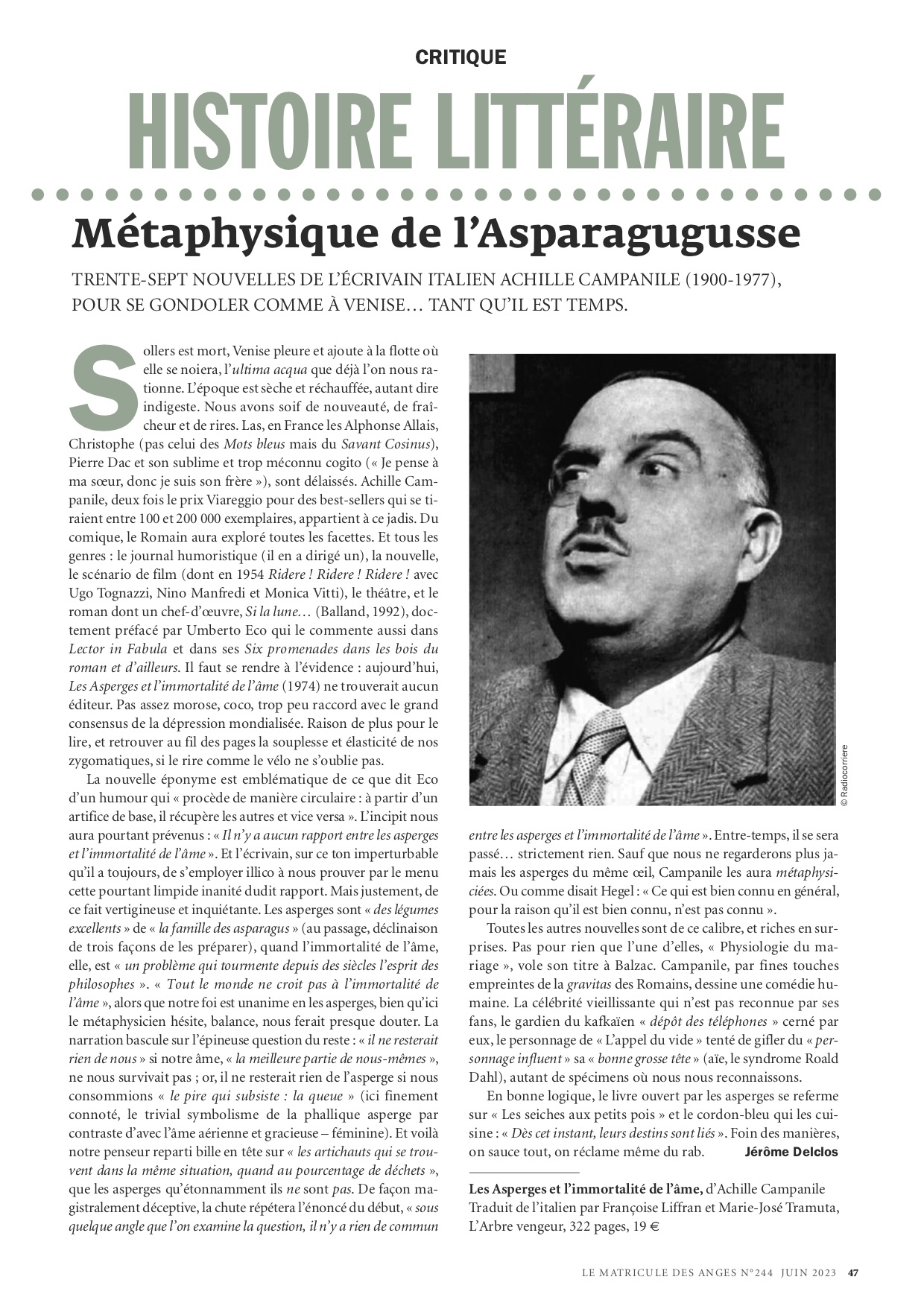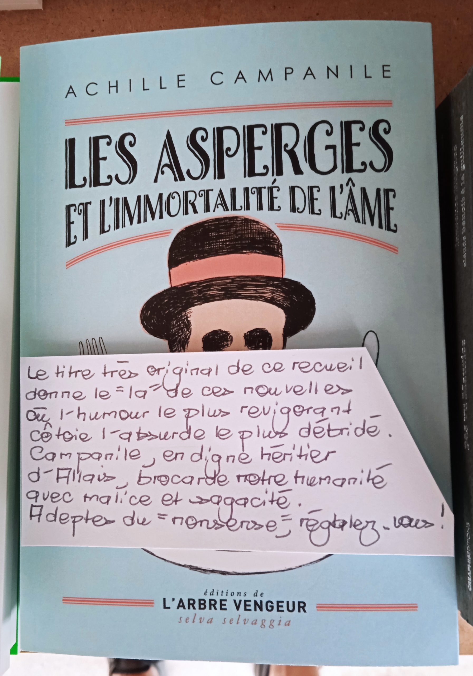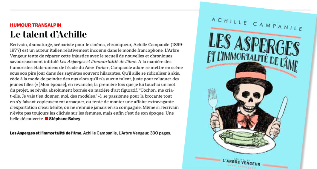 “Quasi inconnu en France, Achille Campanile est un monument de la littérature comique en Italie, célèbre pour ses scénarios, romans et chroniques. Voici une trentaine de récits brefs à l’humour loufoque et saugrenu, qui font de lui une sorte de cousin transalpin de Pierre Dac ou d’Alphonse Allais.”