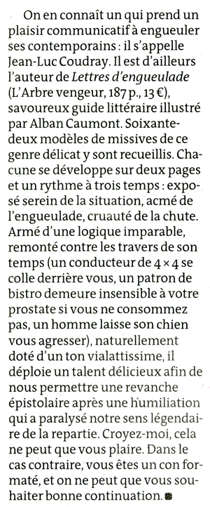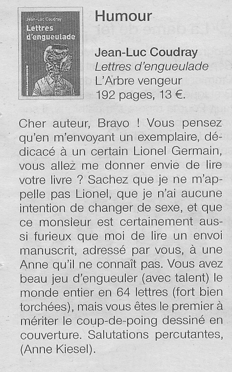 Avec ces soixante-deux lettres cogitées par le cerveau vengeur de Jean-Luc Coudray, voici de quoi désamorcer le souvenir de ces situations humiliantes. Leur lecture permettra de calmer nos amères ruminations et, si nous retrouvons notre bourreau, d’espérer crucifier sa basse conscience, réveillant chez nous cette sérénité que procure le rééquilibrage du monde.